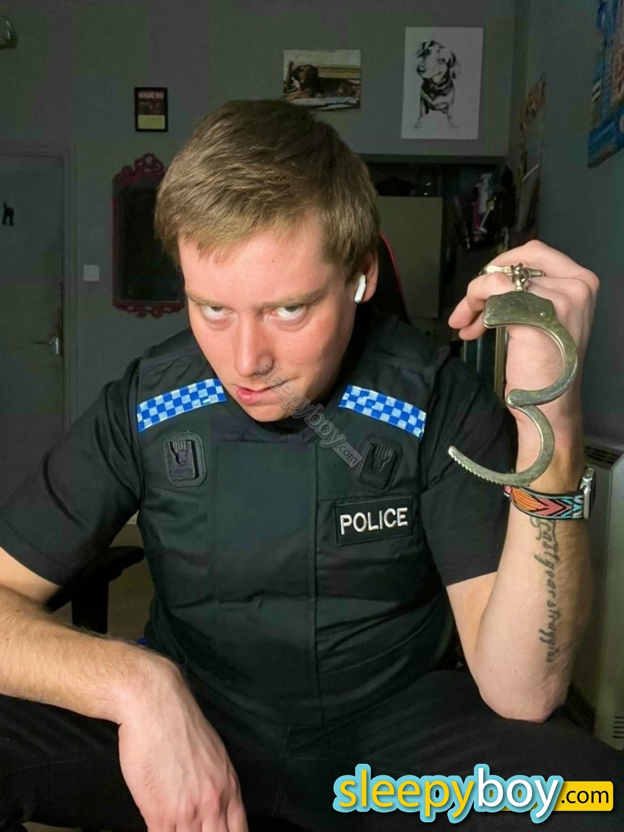 Thirdly , once I was greeted by his gorgeous dog and fed him, it was time for PC Ryan to arrive, the dirtiest, toughest cop on the South Coast . Once rubbed down with a little non-compliance from myself he had my arms around my back cuffing me .